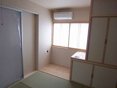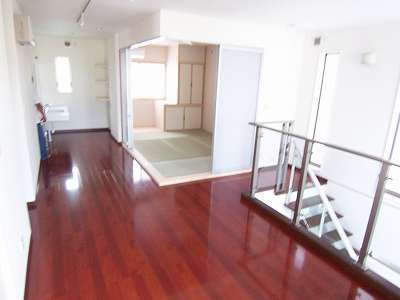 内装は、部屋ごとに異なるフローリングの色味を採用し、空間に個性を持たせつつも、全体として統一感のある仕上がりに。赤みのある木目フロアが映えるリビング空間には、畳スペースも併設されており、洋と和の調和がとれた居住性の高い設計となっています。